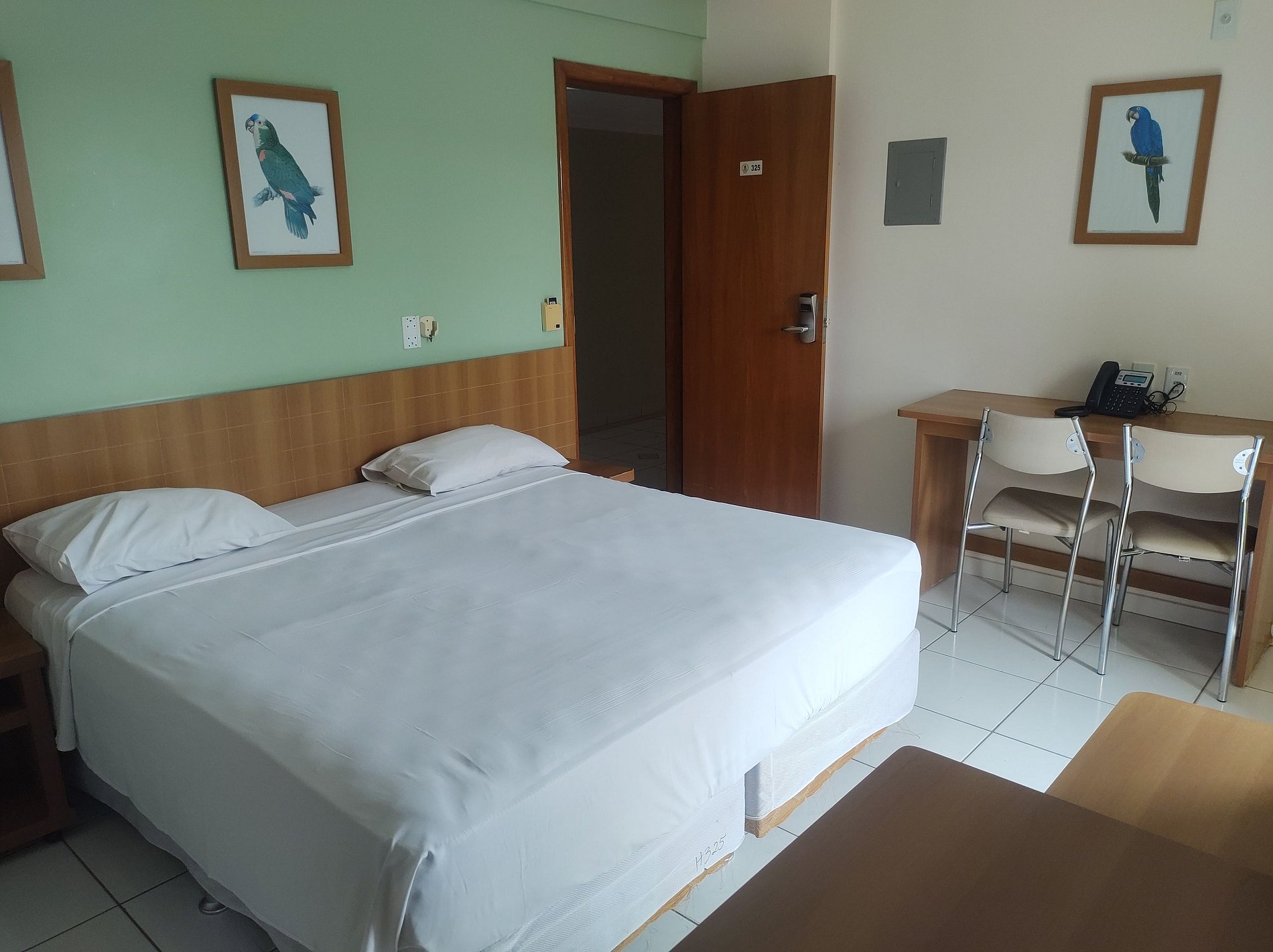 Suite hotel ambiente único com cama de casal e de solteiro, tv, frigobar, ar condicionado, banheiro e sacada