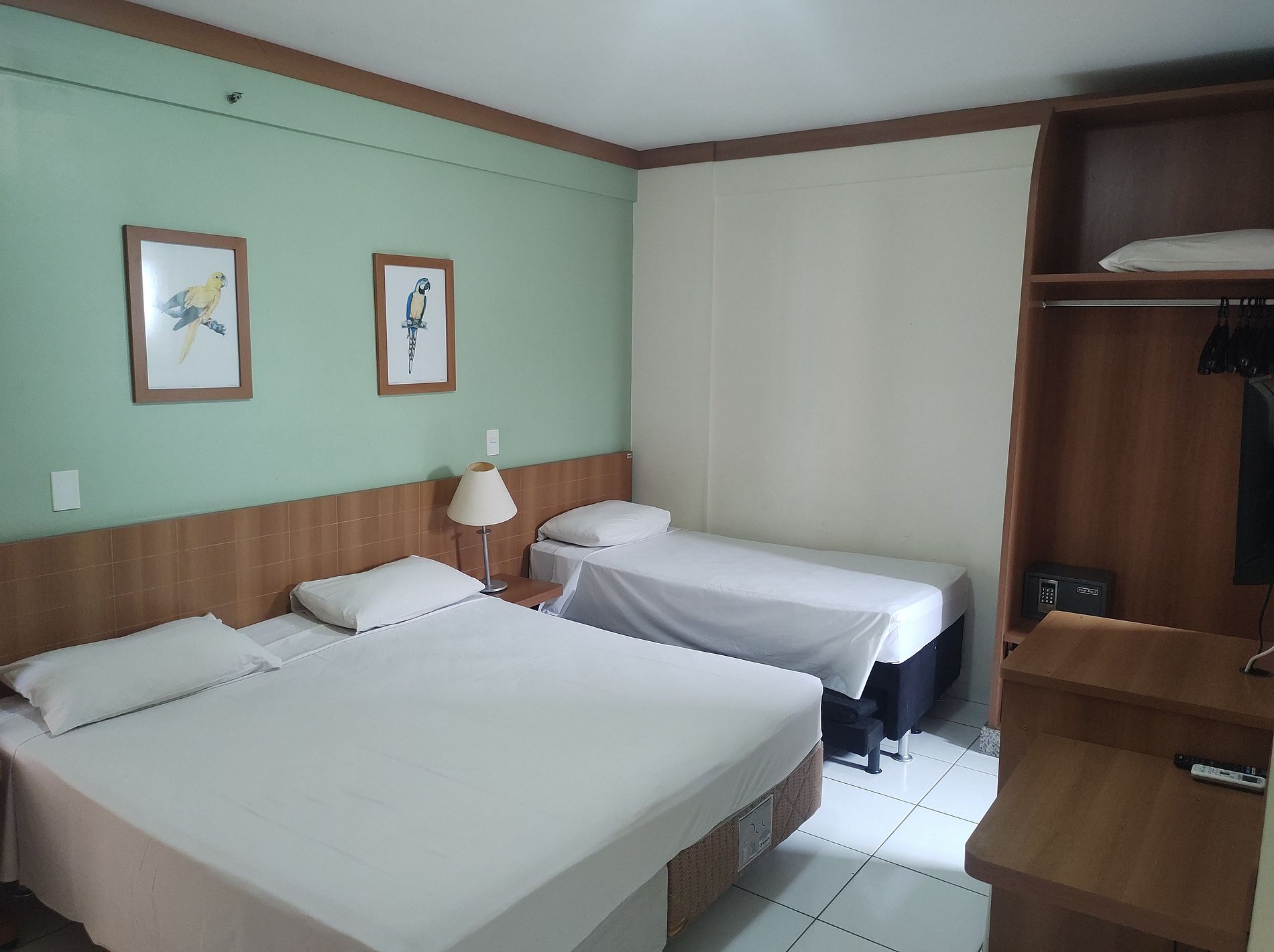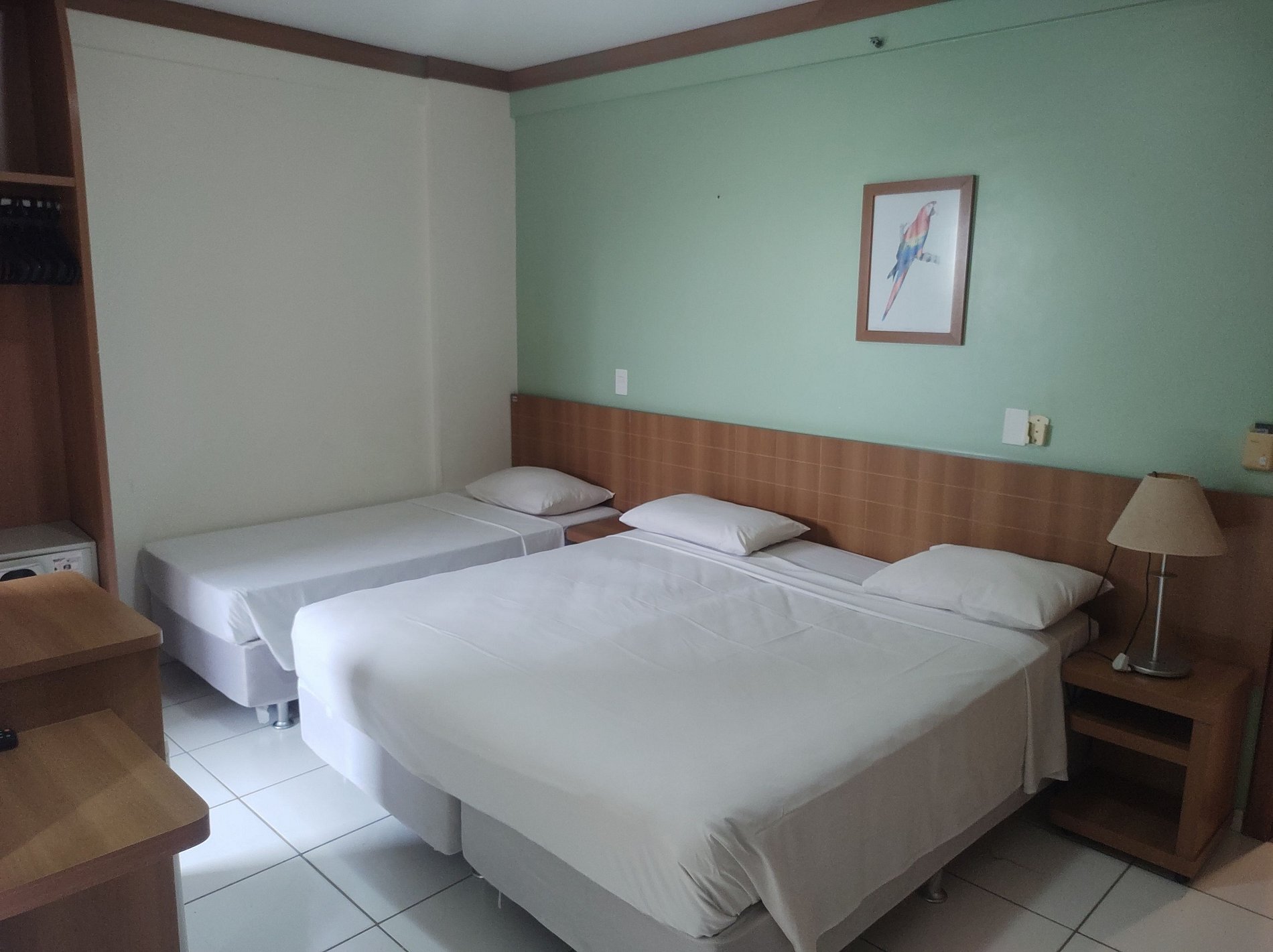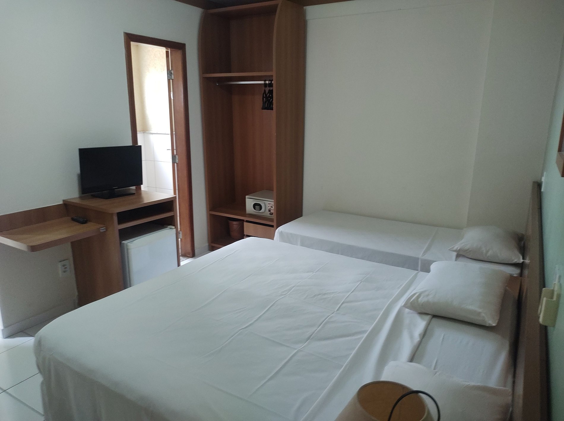 Suite ambiente unico com cama de casal e de solteiro , tv, frigobar , ar condiconado , banheiro e sacada.