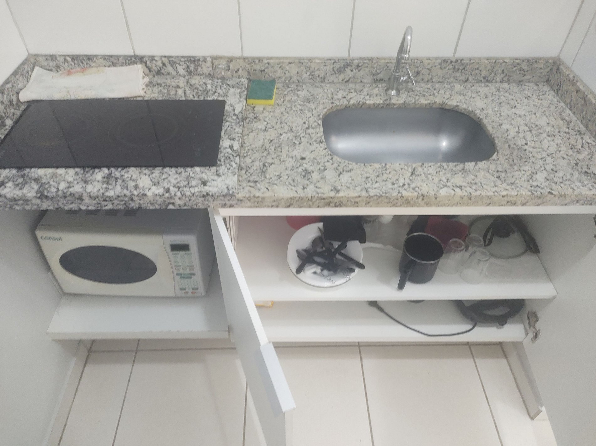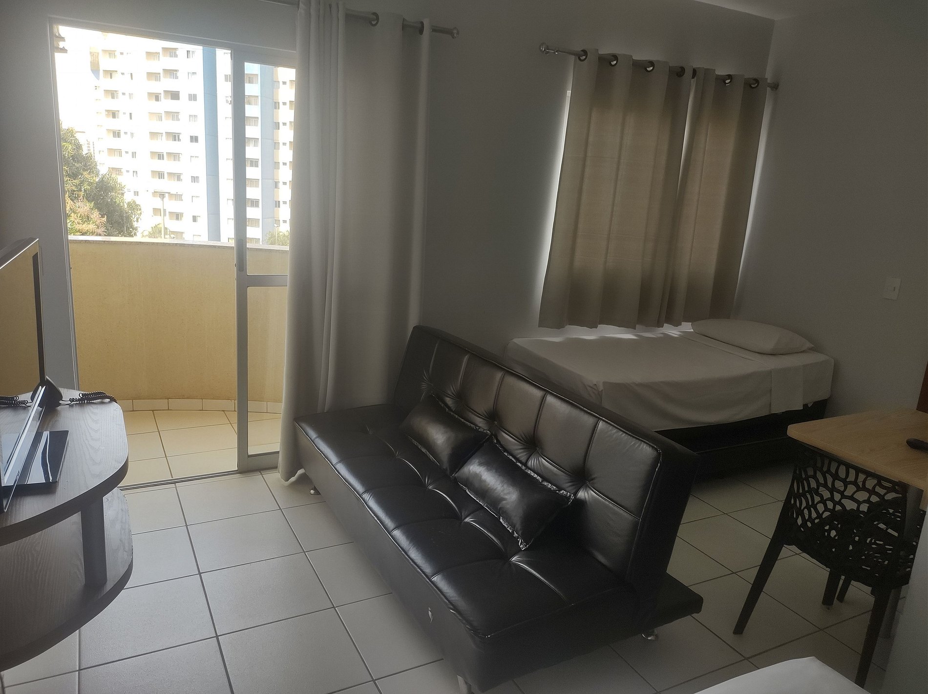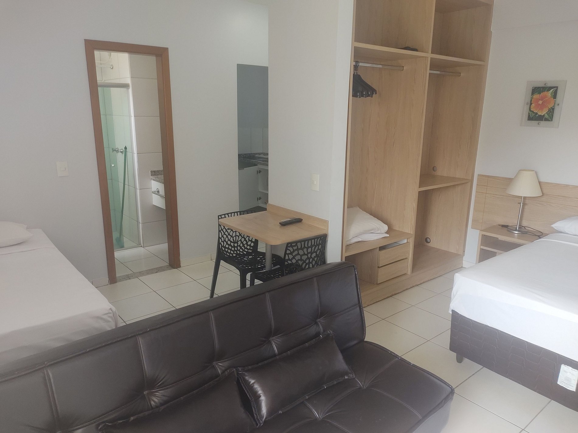 Flat ambiente unico com sacada, contendo cama de casal, sofá bicama e colchaão extra de soteiro, TV, ar-condicionado, pia, frigobar e microondas.