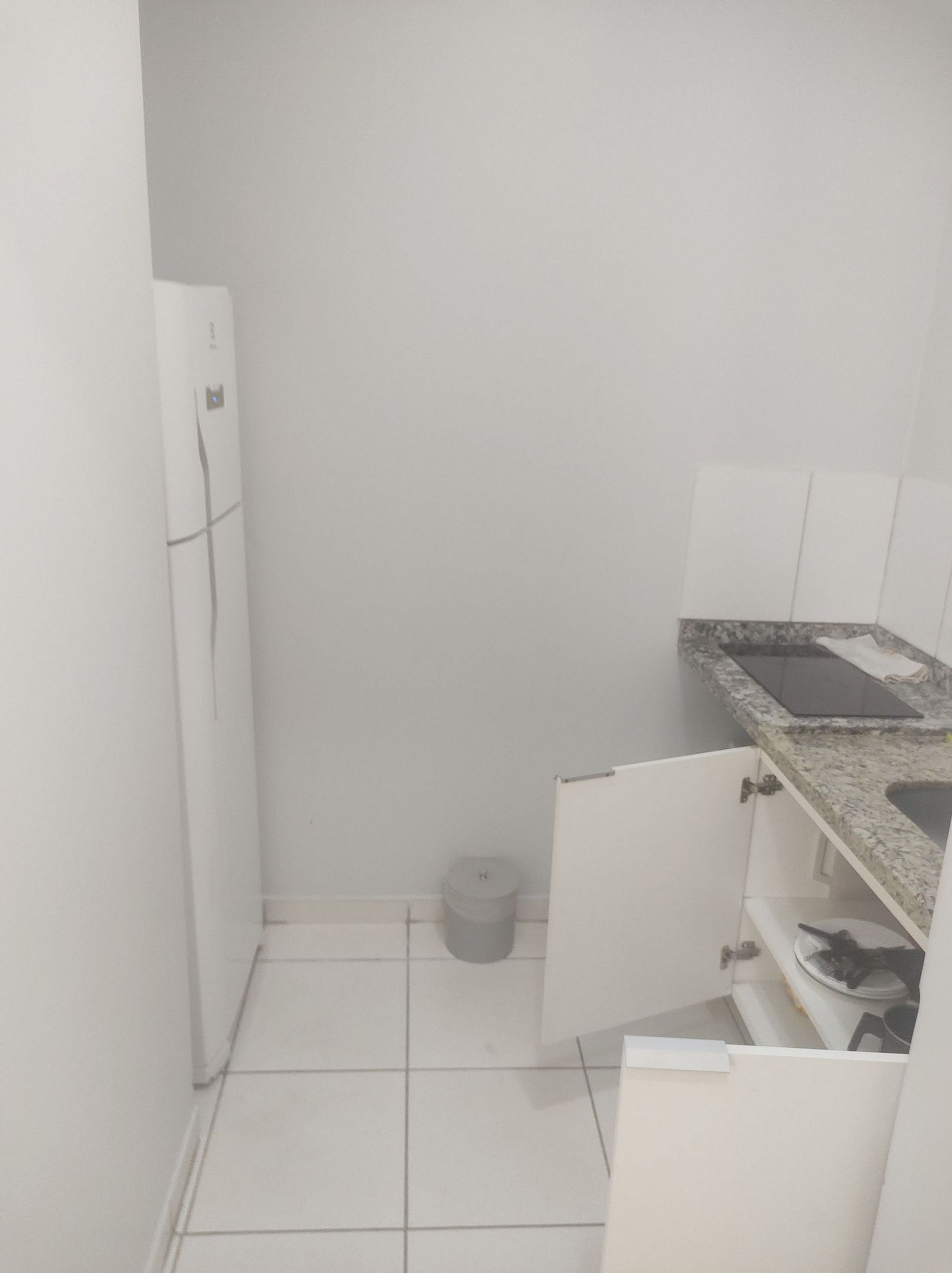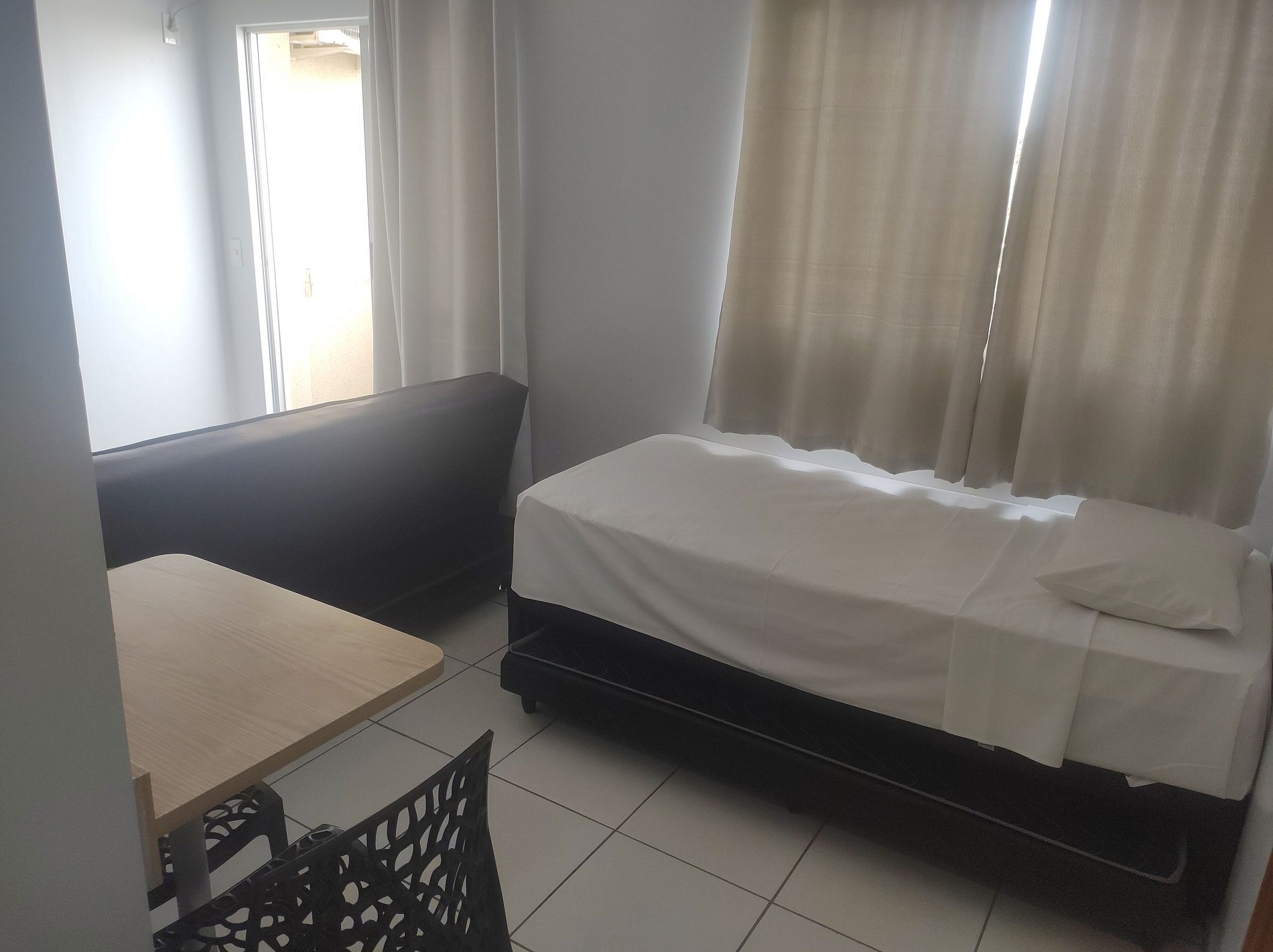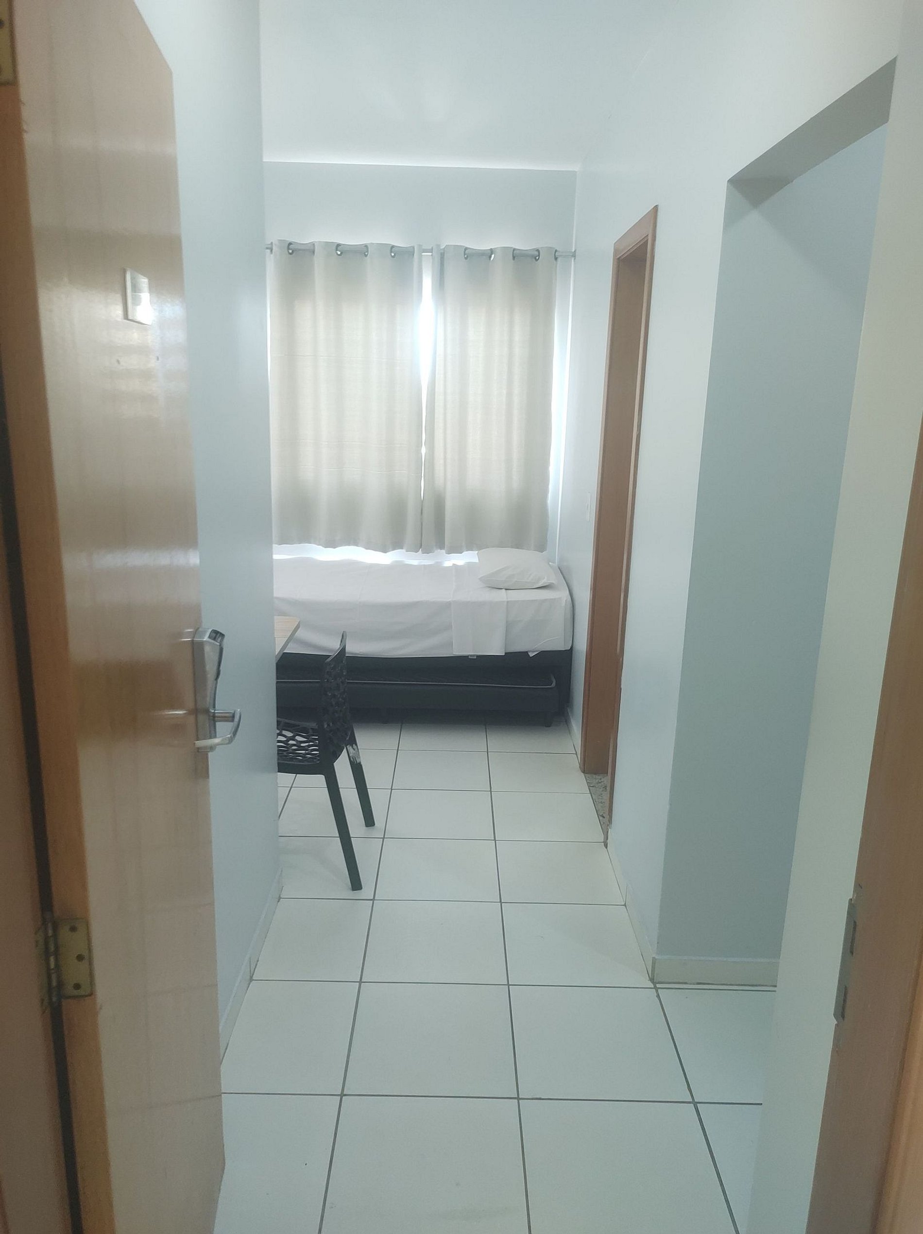 Flat ambiente unico com sacada, contendo cama de casal, sofá bicama e colchaão extra de soteiro, TV, ar-condicionado, pia, frigobar e microondas.