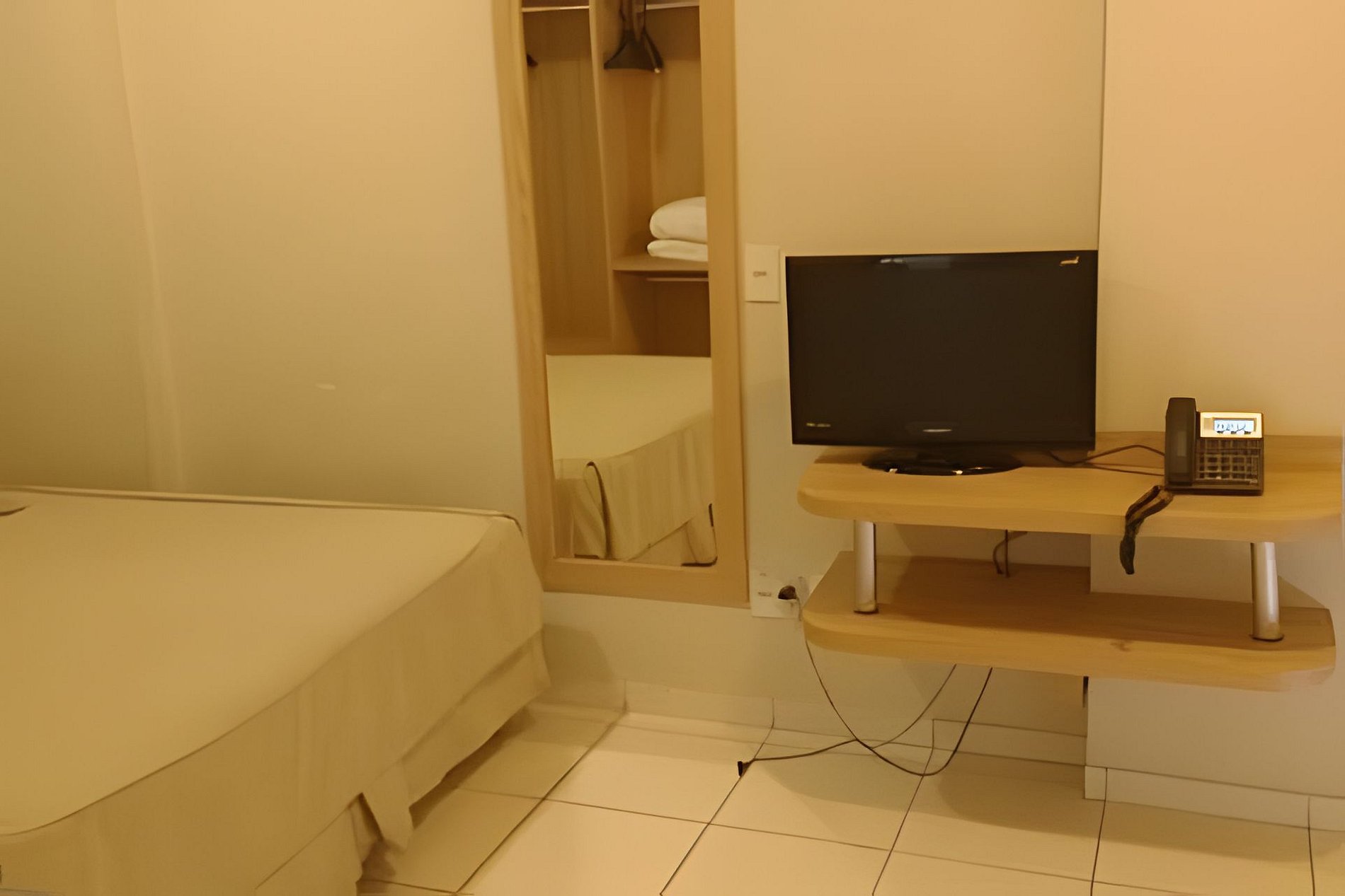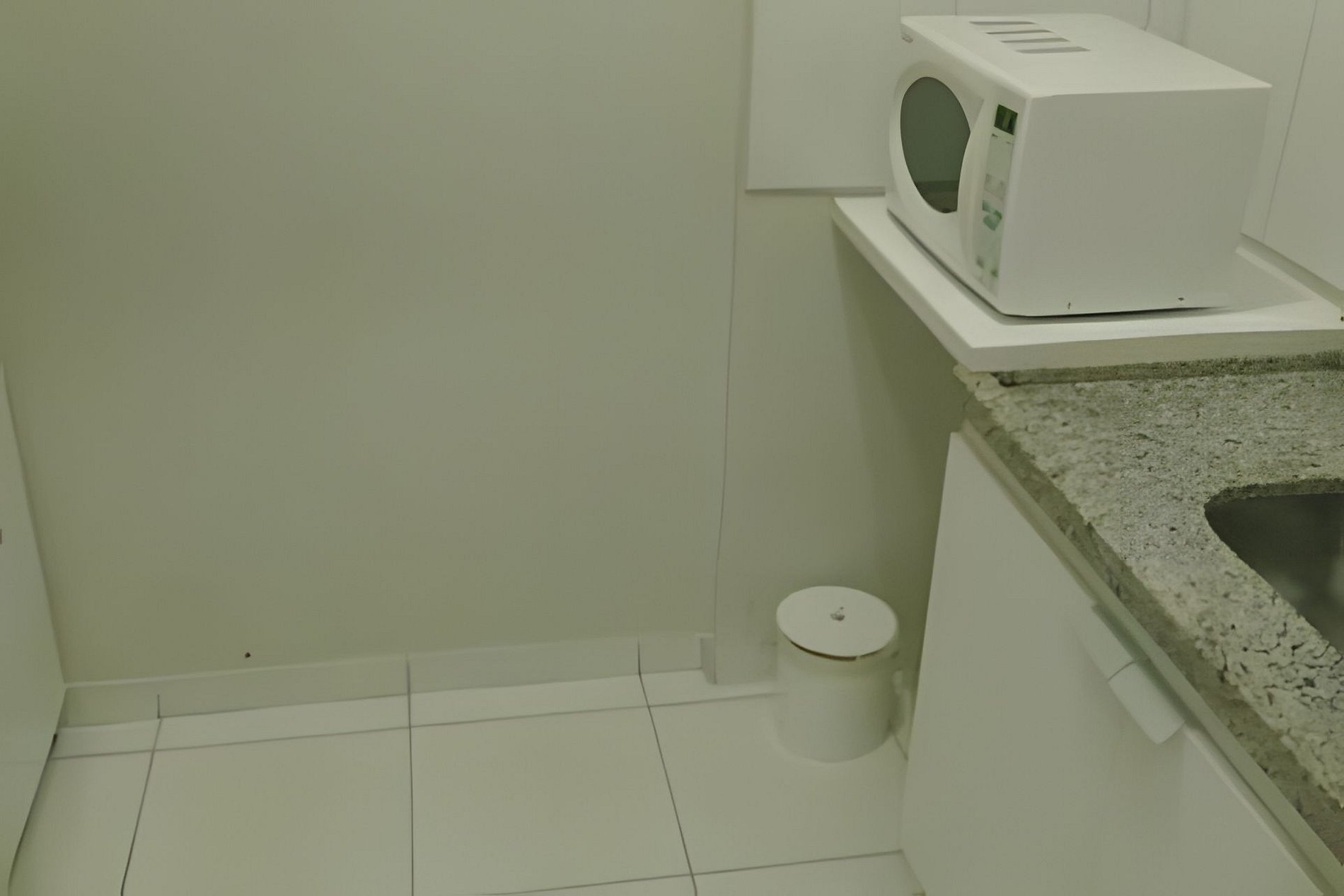 Apart ambiente unico com copa compacta, pia , frigobar e microondas, quarto, banheiro e sacada.