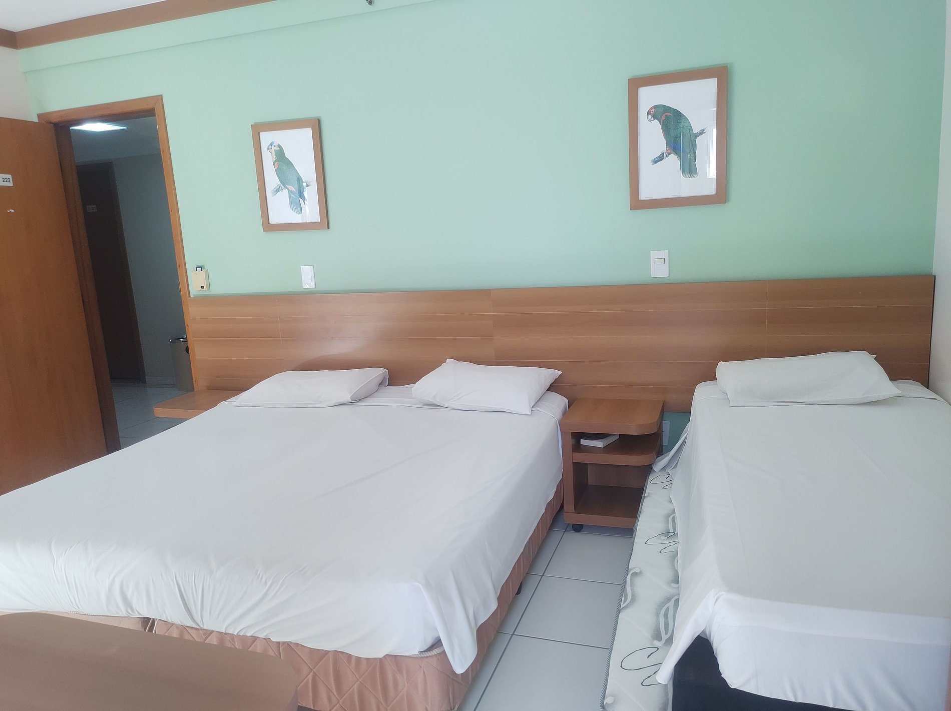 Suíte ambiente unico com sacada, composta com cama de casal, cama de solteiro com auxiliar. TV e ar-condicionado e frigobar.
