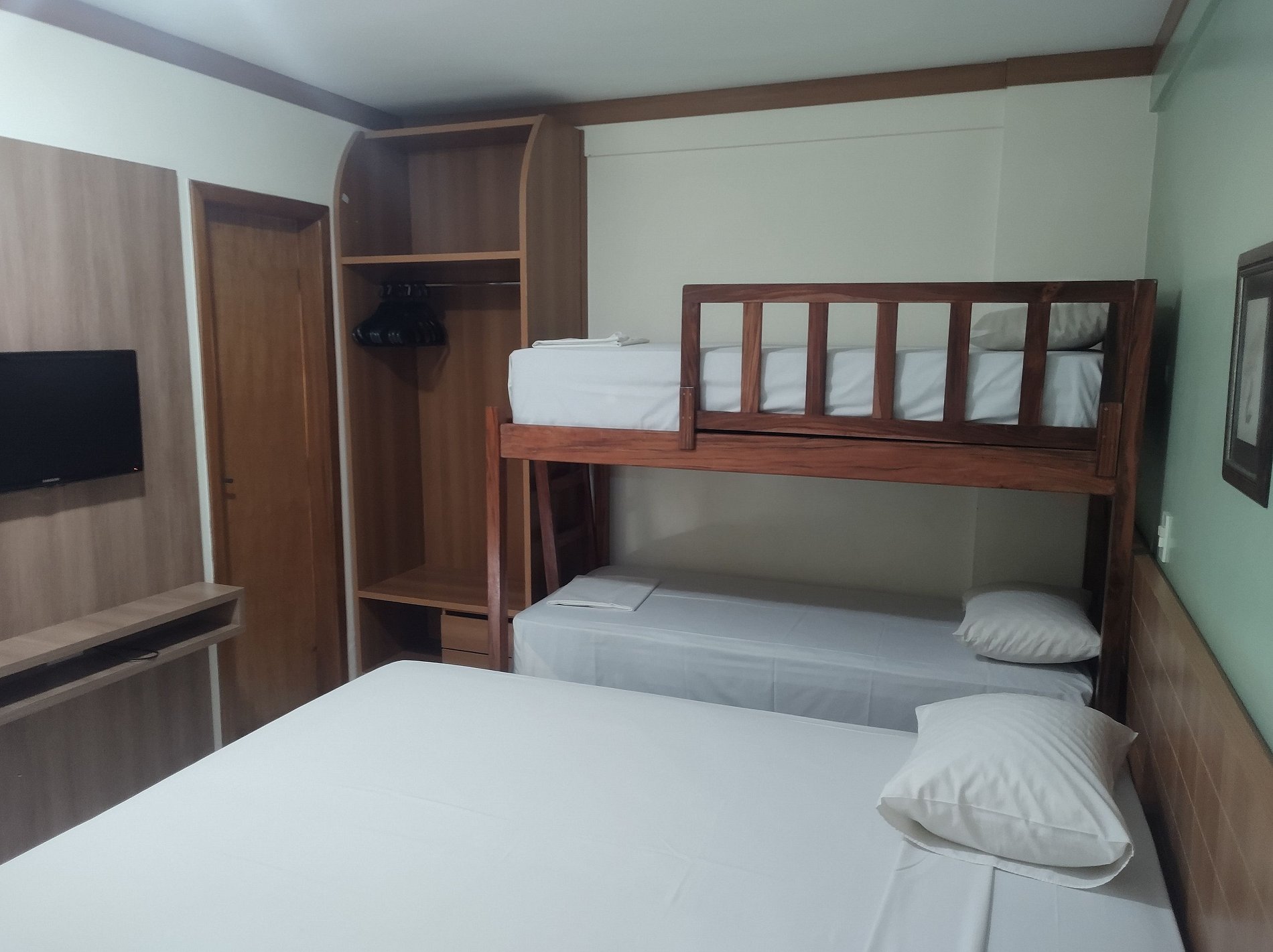 Suíte ambiente unico com sacada, composta com cama de casal, cama de solteiro com auxiliar. TV e ar-condicionado e frigobar.